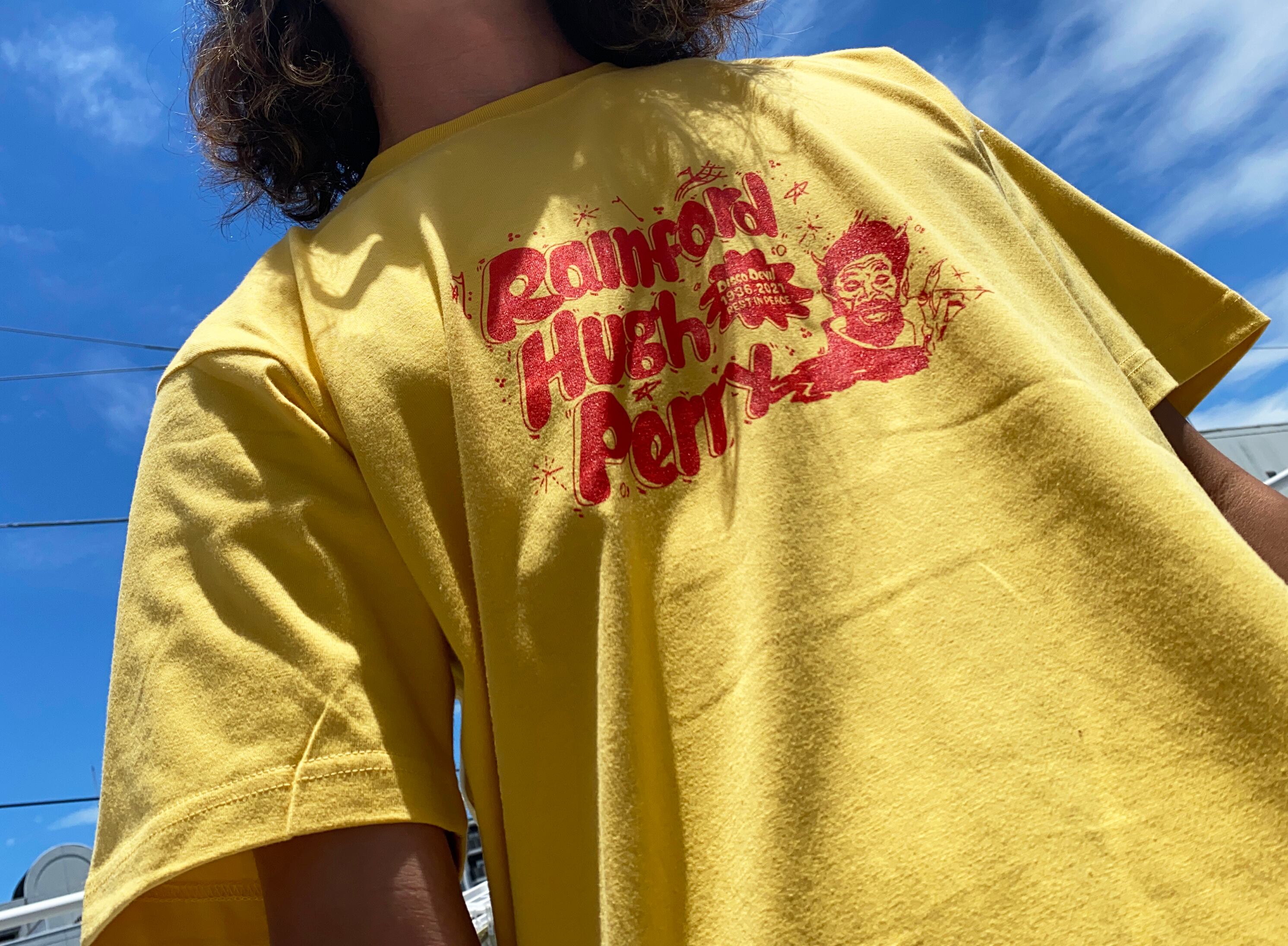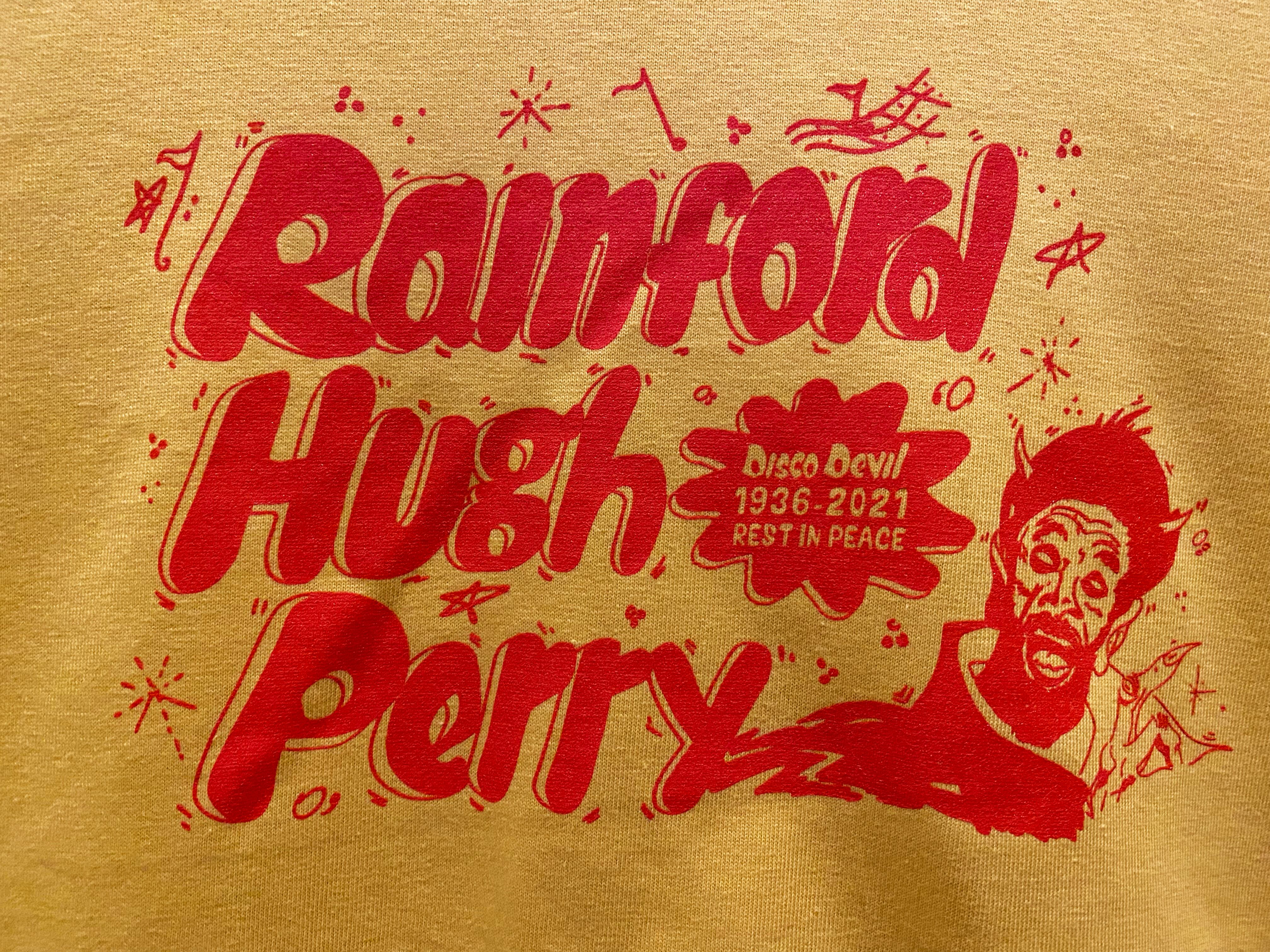 この夏、一周忌を迎えられるジャマイカの伝説的音楽プロデューサーを偲んで彼の本名を刻んだTシャツを制作しました。元ネタはもちろんあの12インチです。